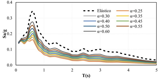 Las expresiones matemáticas propuestas se ajustan adecuadamente para un intervalo de relaciones de rigidez 0.25≤α≤0.50 con sus respectivas relaciones de resistencia γ propuestas, y para periodos mayores a 0.3 s.