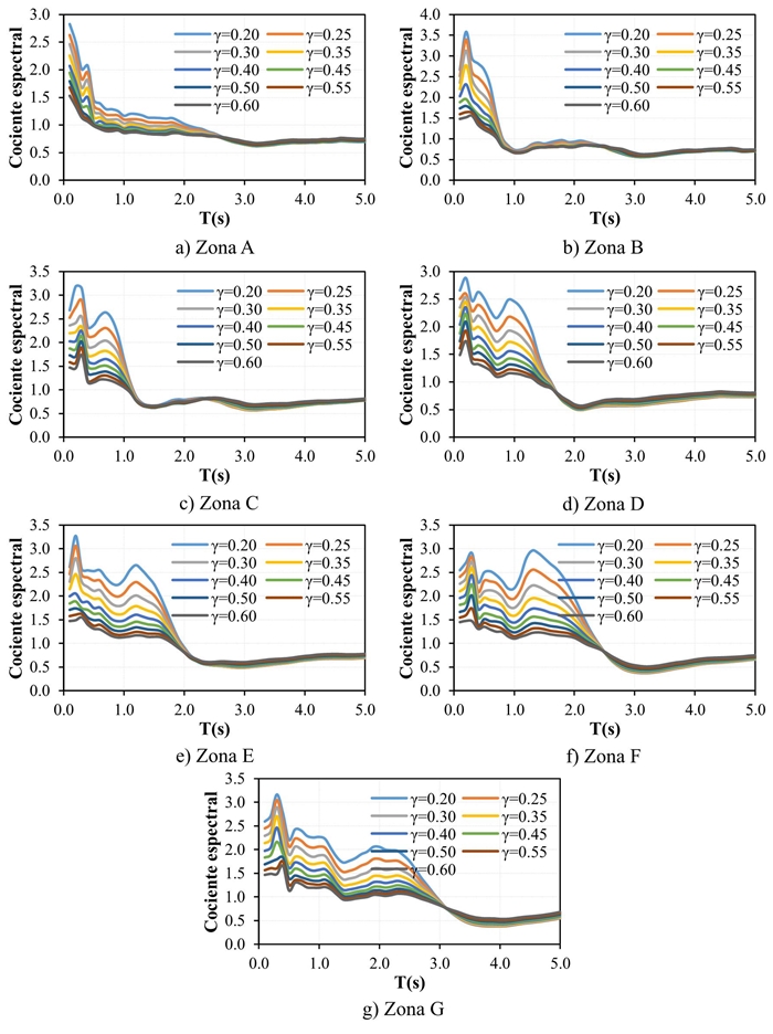 Los cocientes entre ETEU de desplazamiento se obtuvieron para diferentes combinaciones del sistema dual dado por los parámetros α y γ (ver tabla 1) y para las diferentes zonas de la ciudad de México (ver tabla 3). En la figura 16 se muestra la forma de los cocientes de ordenadas espectrales de desplazamiento considerando α=0.30 y distintos valores de γ para las siete zonas consideradas. En las figuras se observa que el periodo característico (Tc) previamente definido, es distinto para cada zona y tienen un valor muy cercano al periodo dominante del suelo para el caso de suelos blandos (Ts>1.0 s). Para el caso de suelos con Ts≤1.0 s correspondientes a las zonas A (suelo firme) y B (suelo intermedio) el periodo característico no tiene relación con el periodo dominante del suelo (porque aquí se define el periodo dominante en función del espectro de aceleración y no del de desplazamiento). En las figuras 16a a 16g se observa que la forma y los valores de los cocientes espectrales son diferentes para cada zona; por lo tanto, las expresiones propuestas en la siguiente sección tienen parámetros diferentes, según el tipo de suelo que se trate.