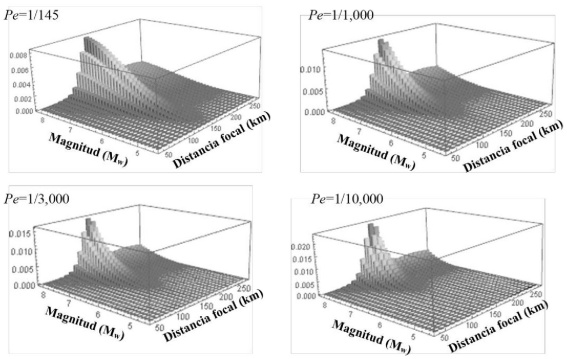 donde Nf es el número de fuentes sísmicas, M0 y Mu son las magnitudes mínima y máxima consideradas dentro del catálogo de eventos sísmicos de cada fuente, respectivamente, λ(M) es la tasa de excedencias de las magnitudes y R es la distancia representativa desde la fuente sísmica hasta el sitio en estudio. En adición, si se considera que el tiempo de ocurrencia T entre fallas sigue un proceso de Poisson homogéneo, entonces la probabilidad anual de falla pF(1 año) se calcula mediante una función exponencial de probabilidad con parámetro νF , de tal forma que: