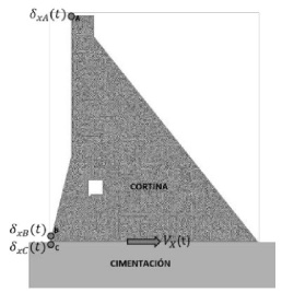 En el Manual de Capacitación de Seguridad de Presas de la Comisión Nacional del Agua (CONAGUA, 2001) se menciona que los modos principales de falla de presas rígidas ante excitaciones sísmica son la falla por esfuerzos internos, en el cuerpo de la cortina y la falla de la cimentación. En presas existentes se han reportado agrietamientos por esfuerzos excesivos de tensión en la ubicación de discontinuidades geométricas de la cortina. Estos esfuerzos de tensión son la causa principal de agrietamiento en presas de concreto. En la figura 3 se muestra un esquema con el comportamiento de una presa rígida de concreto durante una excitación sísmica.