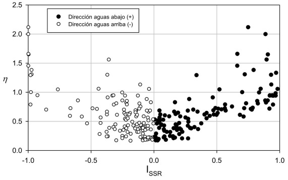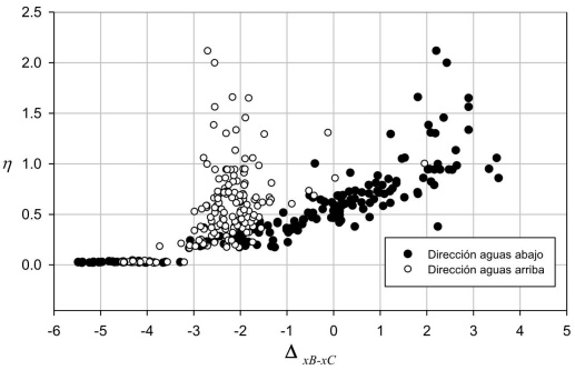 1. Se ajustaron los valores de η en función de xB-xC mediante una regresión no lineal de la forma η=ae b(ΔxB-xC) , obteniéndose un coeficiente de correlación R 2 = 0.91. Es útil recordar que: xB-xC=lnSlb_MEF2D=lnmax0t80[δxBt-δxCt] .