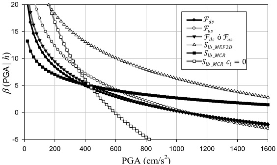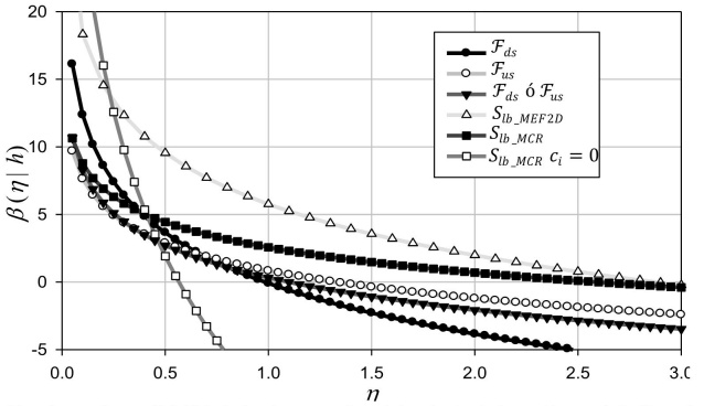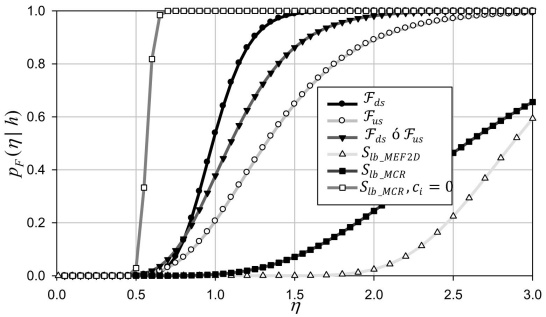 Las funciones de confiablidad se presentan en figura 21 para los tres casos de falla descritos anteriormente. En esta figura β es el índice de confiabilidad propuesto por Cornell en 1969 y h representa el nivel fijo en el embalse considerado durante los análisis dinámicos. Finalmente, la función de probabilidad de falla pF(η|h) se presenta también en la figura 21, calculada como pF(η|h)=Φ(-β) , donde Φ(∙) se refiere a la función de distribución de probabilidad normal estándar.