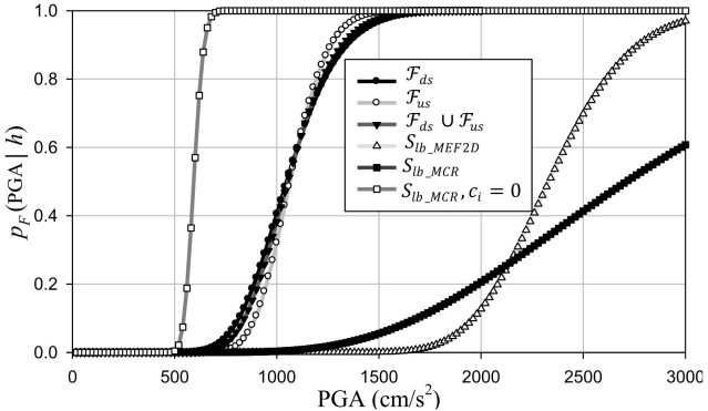 En la ecuación 3 el término Eδ|y,h se refiere a la esperanza del costo de los daños δ producidos por la falla de la presa cuando se presenta un sismo con intensidad y y el embalse tiene un nivel de agua h, pF(y|h) es la probabilidad de falla última (colapso) de la cortina o cualquier componente de la presa cuando está sujeta al sismo con intensidad y dado que el embalse tiene el nivel h, δF es el costo esperado del colapso en caso de que ocurra y δ(y,h|S) es el costo esperado de los daños para un sismo con intensidad y y un nivel h en el vaso, condicionados a la sobrevivencia de la presa. Nótese que la probabilidad de falla no depende solo de la intensidad sísmica y y del nivel del agua h, sino también del daño inicial, DitE , así como de la función de degradación de la resistencia y rigidez, ϱ(tj) , que varía con el tiempo. Con la ecuación 3 pueden elaborarse curvas de vulnerabilidad sísmica suponiendo que tanto la intensidad sísmica (y) como el nivel del agua (h) son conocidos y las propiedades mecánicas de los materiales son variables aleatorias.