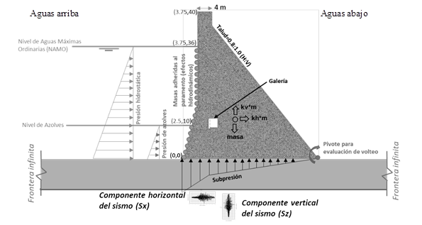 La geometría de la cortina y las solicitaciones impuestas se muestran en la figura 5. Se consideró una altura de cortina de 40 metros y un nivel fijo en el embalse (h) a 36 metros sobre el nivel del fondo del cauce y sus respectivas masas adheridas para representar los efectos hidrodinámicos. Se supuso una eficiencia del 55% en el sistema de drenaje y un espesor de 10 metros de azolves. La sección geométrica de la cortina fue diseñada satisfaciendo los factores de seguridad ante volteo, deslizamiento y esfuerzos excesivos en su base, conforme a las recomendaciones del Manual de Obras Civiles de la Comisión Federal de Electricidad (MOC, 2015). Se utilizó como coeficiente sísmico horizontal kh=a0/(1+2a0) actuando en la dirección aguas abajo, con a0 definida como la aceleración máxima en roca (PGA, por sus siglas en inglés), asociada al nivel de intensidad sísmica de diseño (probabilidad anual de excedencias 1/10,000). Adicionalmente se consideró un coeficiente sísmico vertical tomado como kv=2kh/3 .