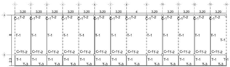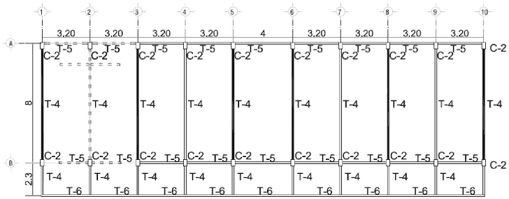 La escuela constaba de marcos de concreto reforzado de f´c=250 kg/ cm2 con muros de mampostería de 12 cm de espesor, con losa maciza de 12 cm, y área de cada planta de 301.92 m2, con 8 crujías del lado largo de 3.19 m, y una de 4 m (figura 7). Asimismo, en las figuras 8 y 9 se muestran con líneas punteadas los muros que son de mampostería de 12 cm de espesor.