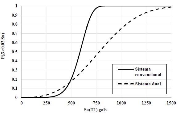 En la ecuación (2) D ̂_├ lnD┤|Sa y σ_├ lnD┤|Sa son la media y desviación estándar del 〖ln〗_D, respectivamente, y ∅(.) es la función de distribución acumulada. En la figura 9 se muestran las curvas de fragilidad sísmica para los dos sistemas estudiados, dichas curvas fueron evaluadas para una distorsión máxima de entrepiso de 0.02. Como se puede observar en la figura el comportamiento es diferente para cada sistema, por ejemplo, si comparamos la probabilidad condicional para una intensidad de 600gals se obtiene para el sistema convencional 0.55 mientras que para el sistema dual se tiene una probabilidad de 0.28. Estos resultados reflejan un mejor comportamiento en el sistema con muros de cortante ya que tener una menor probabilidad de excedencia para el mismo nivel de intensidad genera una mayor seguridad estructural. Nótese que conformen la intensidad va aumentando los niveles de seguridad para el edificio con muros de cortante son mayores que para el edificio convencional, esto es especialmente cierto para niveles de intensidad mayores que 500gals.