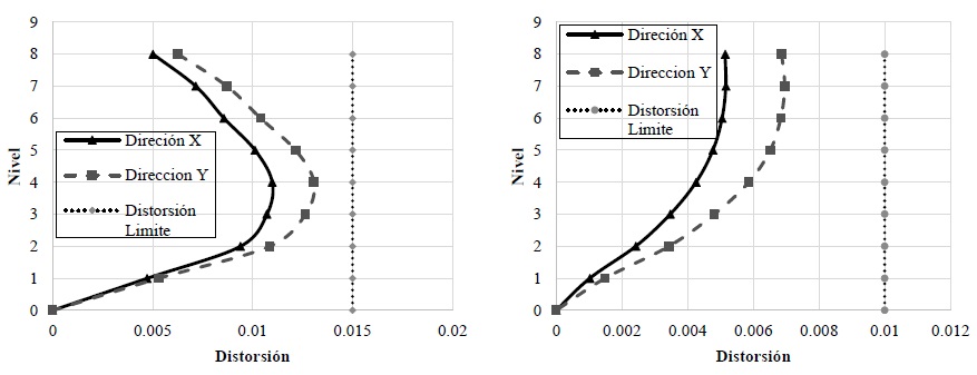 Se analizan 2 edificios de concreto reforzado de 8 niveles. Para los modelos de los edificios se utilizó un factor de comportamiento sísmico Q = 2. Las distorsiones de entrepiso de los edificios de concreto reforzado se limitaron para el estado límite de colapso a d/h = 0.015 y d/h = 0.01 para el sistema convencional y sistema dual respectivamente. En cuanto al estado límite de servicio, se consideró una distorsión límite para ambos sistemas de d/h = 0.002; donde d, es el desplazamiento y, h, la altura del entrepiso.