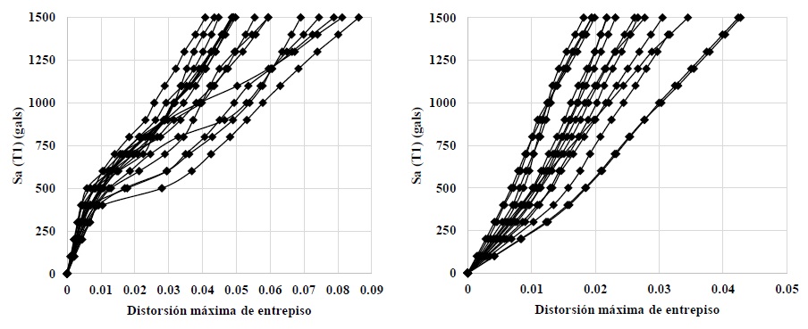 Se realizó un análisis no lineal paso a paso a los dos modelos considerados, ambos sistemas fueron sometidos a los doce registros sísmicos mostrados en la Tabla 1. Los registros fueron escalados para diferentes niveles de intensidad en términos de la pseudoaceleración en el modo fundamental de vibración de la estructura Sa(T1), estos van desde 100gals hasta 1500gals. Como se mencionó anteriormente esta técnica de análisis se conoce como ADI, y esta proporciona una idea clara de la capacidad y niveles de deformación que puede presentar un sistema. La figura 8 muestra el análisis dinámico incremental para los dos sistemas estructurales, se puede observar las diferencias que tienen ambos, por ejemplo, si consideramos un nivel de deformación de 0.2% se tiene que para el sistema convencional corresponde una pseudoaceleración espectral de 630gals mientras que para el sistema dual una pseudoaceleración espectral de 900gals. Por esta razón el sistema dual provee un mayor margen de seguridad ante diferentes estados límites de diseño o intensidades. Además, el sistema dual tiene una mayor rigidez que el sistema convencional esto se puede observar en la pendiente de las curvas mostradas, también un aspecto importante es que el sistema dual permanece en el rango elástico para niveles de intensidad más grandes.