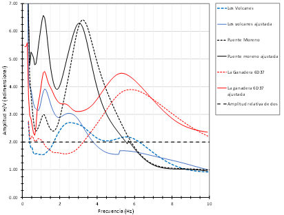 3. Ajuste de las amplitudes relativas de los HVNSRs seleccionados mediante las FAARs promedio. Para esto, las amplitudes relativas de los tres NHVSRs seleccionados en la etapa anterior se multiplicaron punto a punto por la FAAR promedio desnormalizada correspondiente al suelo de dunas. En la Fig. 4 se comparan los tres NHVSRs seleccionados con sus correspondientes ajustados.