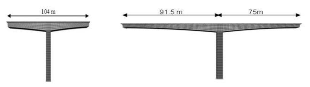 Se consideró un tercer puente, construido por el método de doble voladizo. Se trata de un puente de tres claros de 349 m de longitud, dividido en claros extremos de 94.5 m y un claro principal de 160 m (Figura 22). La superestructura es un cajón de concreto reforzado de una sola celda con sección variable, cuyo peralte es de 3 m en el centro del claro y de 9 m sobre la pila. La superestructura se construyó mediante 56 segmentos de 4.6 m de longitud, 4 segmentos de 6 m y una dovela de cierre de 4 m. Las pilas tienen sección cuadrada hueca de 6 x 6 m con espesor uniforme de 0.8 m. La altura de la pila es de 58 m.