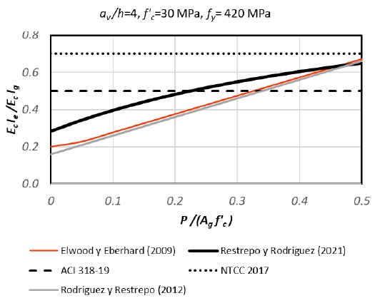 Estos resultados indican que es deseable que tanto la NTCC, como futuras normativas en México especifiquen rigideces efectivas congruentes con la información existente de estudios experimentales y analíticos de elementos estructurales que responden a acciones sísmicas. La ec. (12a) fue propuesta por Rodriguez y Restrepo (2012) para la rigidez efectiva de columnas de concreto reforzado: