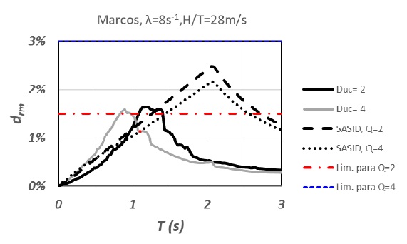 Como se ha mencionado, en el procedimiento de cómputo aproximado de la distorsión d rm , en el caso de estructuras a base de marcos se emplea el índice de rigidez H/T=28 m/s. Los resultados obtenidos con este procedimiento para la distorsión de entrepiso, d rm , correspondientes a los referidos espectros de diseño para los casos Q=2 y Q=4 se muestran en la Fig. 11, los que se identifican en esta figura como los casos SASID, Q=2 y SASID, Q=4, con líneas punteadas gruesa y delgada, respectivamente. La Fig. 11 muestra además las distorsiones d rm que resultan del análisis no lineal de estructuras a base de marcos, con el procedimiento aproximado descrito, empleando el registro de aceleraciones S00E obtenido en la estación Miramontes en el terremoto de 2017, el valor de la fracción de amortiguamiento crítico ξ= 5%, y considerando los casos de ductilidades de desplazamientos, μ, iguales a 2 y 4, las que se muestran con líneas continuas negra y en gris, como Duc= 2 y Duc= 4, respectivamente.