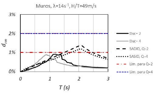 La Fig. 13 muestra también que, en edificios con muros estructurales donde H/T=49 m/s, las demandas de distorsiones de entrepiso obtenidas del análisis no lineal con el registro S00E de la estación Miramontes, con ductilidades de desplazamiento iguales a 2 y 4, son menores que el valor máximo de distorsión permitido de 1 %, como muestran las líneas continuas Duc= 2 y Duc= 4 en la Fig. 13.