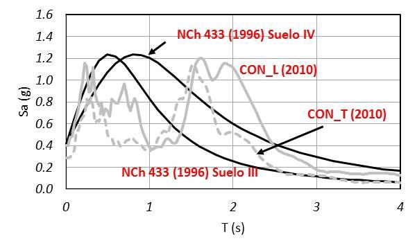 Los resultados de las Fig. 2 muestran que las ordenadas espectrales elásticas calculadas para registros de la estación Concepción Centro, en sus componentes horizontales L y T, son bastante mayores que las especificadas por la normativa local para suelos Tipo III, en la zona de periodos estructurales en el intervalo aproximado de 1.5 s a 3 s. La Fig. 2 muestra que el intervalo de periodos entre alrededor de 1.5 s a 2.5 s, las ordenadas espectrales de los registros de la estación Concepción Centro superaron incluso a los valores especificados por la normativa NCH 433 para estructuras en suelo Tipo IV. Debido esta experiencia en el terremoto de Maule, la normativa de diseño sísmico en Chile en 2011 cambió la clasificación sísmica del terreno, aumentando dos tipos de suelos más (Diario Oficial, 2011).