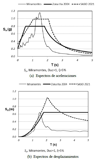 En este trabajo se emplean registros de aceleraciones obtenidos en la estación Miramontes en el sismo del 19 de septiembre de 2017. Esta estación se ubica en el sur de la Ciudad de México, empezó a funcionar después de la ocurrencia del terremoto del 19 de septiembre de 1985, y está bastante lejos de la zona donde ocurrió la mayor parte de colapsos de edificios en la Ciudad de México en ese evento sísmico. La mayor parte de los daños y colapsos observados en edificios en la Ciudad de México en el terremoto del 19 de septiembre de 2017 ocurrieron en edificios ubicados en suelos con valores semejantes de periodos dominantes del terreno, T s , del orden de 1 s a 1.5 s (Rodriguez, 2020), intervalo donde se ubica el periodo dominante del suelo de la estación Miramontes. La Fig. 5 muestra con línea continua delgada, los espectros de aceleraciones y desplazamientos elásticos obtenidos para el registro S00E de esta estación en el terremoto de 2017. La línea continua gruesa en la Fig. 5 muestra las ordenadas espectrales elásticas de diseño en la zona de la estación, clasificada como suelo blando, Zona IIIa, de acuerdo con las NTCS (2004), la que era vigente cuando ocurrió el mencionado terremoto. Estas ordenadas se obtuvieron multiplicando las ordenadas espectrales especificadas en las NTCS (2004) por el factor de sobrerresistencia de estructuras, el cual se consideró igual a 2. Los resultados de la Fig. 5 muestran que en zona de periodos aproximadamente entre 1.2 s y 1.6 s, las ordenadas espectrales elásticas de diseño especificadas por las NTCS (2004) subestiman las demandas computadas empleando las aceleraciones registradas en la estación Miramontes. También estas últimas demandas superan en ese mismo intervalo de periodos a las demandas de diseño de las NTCS 2017 (NTCS, 2017) y SASID, las que se muestran con líneas punteadas en la Fig. 5.