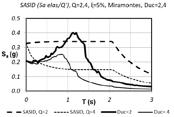 Las líneas punteadas mostradas en la Fig. 6, identificadas como SASID, Q=2 y SASID, Q= 4, se obtuvieron partir de las aceleraciones espectrales elásticas sin reducir estipuladas por la normativa NTCS 2017 (NTCS, 2017) y SASID para el sitio de la estación Miramontes, divididas por los valores correspondientes del factor de reducción por comportamiento sísmico, Q’, para los casos de factores de comportamiento sísmico, Q, iguales a 2 y 4. La Fig. 6 también muestra con líneas continuas las aceleraciones espectrales obtenidas del análisis no lineal de un oscilador de 1GDL cuando responde al registro de aceleraciones S00E obtenido en la estación Miramontes en el terremoto del 17 de septiembre 2017, considerando los valores de ductilidades de desplazamiento, μ, iguales a 2 y 4, líneas gruesa y delgada, respectivamente, para ξ= 5 %. Estos resultados indican que en ciertos intervalos de periodos las demandas sísmicas observadas en el referido terremoto fueron mayores que las estipuladas. Por ejemplo, para el caso de μ = 2, aproximadamente este intervalo de periodos fue de 0.9 s a 1.3 s, y para el caso μ = 4, el intervalo fue de 0.3 s a 1.1 s, ver Fig 6.