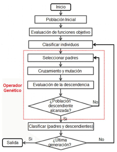 En la sección anterior se muestra de forma detallada los datos utilizados para la creación de las bases de datos y la evaluación de los individuos. Para combinar todo esto con el algoritmo NSGA-II, se desarrolló un programa de cómputo en el lenguaje de programación Visual Basic, cuyo procedimiento se basa en el diagrama de flujo de la Figura 1: