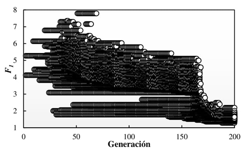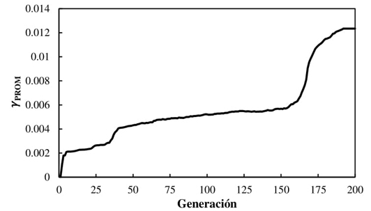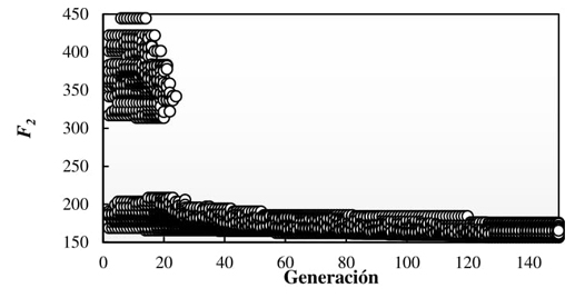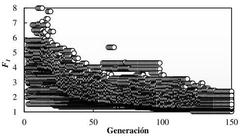 Este modelo corresponde a un edificio con 31.5 metros de altura, y cuenta con tres tipos de secciones para cada elemento estructural (trabes, columnas y CRP) como se muestra en la Tabla 4; es decir, está compuesta por 9 variables. Para llevar a cabo la metodología propuesta basada en la técnica de optimización NSGA-II, se estableció utilizar un total de 150 generaciones compuestas por 200 individuos. El comportamiento del algoritmo depende principalmente de F 1 , debido a que su función es encontrar las estructuras más ligeras que cumplan con los criterios de diseño por desplazamiento y daño. Mediante el proceso de cruzamiento y mutación se espera que, con el paso de las generaciones, ambas funciones objetivo vayan disminuyendo hasta encontrar las soluciones óptimas. Las Figuras 5 y 6 muestran la evolución de F 1 y F 2 se observa que al inicio existen valores muy elevados, ya que la mayoría de los individuos se encuentran penalizados. De igual manera, con el paso de las generaciones se espera que el promedio de las distorsiones máximas de entrepiso (γ PROM ) vaya aumentando, aproximándose al límite permisible (0.02). La Figura 7 grafica el comportamiento de una corrida del algoritmo para el modelo CR-CRP9, donde se aprecia que se cumple lo mencionado anteriormente. Al inicio del algoritmo γ PROM obtiene un valor de 0 ya que todos los individuos creados están penalizados mediante la función P con , y siendo individuos no viables constructivamente, se omite el análisis estructural. En las primeras 50 generaciones el algoritmo encuentra la combinación de secciones transversales con mayor probabilidad de cumplir con los criterios de resistencia, las cuales corresponden a secciones robustas y con grandes cantidades de acero, conformando estructuras sobradas en términos de costo, resistencia y desplazamientos. Con el paso de las generaciones, el algoritmo va descubriendo secciones cada vez más ligeras y con menor cantidad de acero de refuerzo, lo que resulta en estructuras más livianas y con desplazamientos mayores. Sin embargo, dichas estructuras mantienen su seguridad y economía.