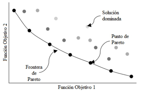 La técnica NSGA-II se utiliza para resolver problemas multi-objetivos, la cual, al finalizar su algoritmo, obtiene un conjunto de soluciones óptimas conocidas como Frontera de Pareto. De este conjunto de soluciones se puede decir que ninguna de ellas es superior a las otras, ya que algunas son mejores en una función objetivo pero peores en las demás formando una curva cuando se consideran dos funciones objetivo como se observa en la Figura 2. Por lo tanto, el objetivo del presente estudio es obtener un conjunto de soluciones óptimas en términos de seguridad estructural (distorsiones máximas permisibles) y costo. Para conocer un poco más del procedimiento general y el proceso para efectuar los operadores genéticos se recomienda verificar estudios previos (Deb et al. 2002; Barraza et al. 2017; Leyva et al. 2018; Rahimbakhsh et al. 2022).