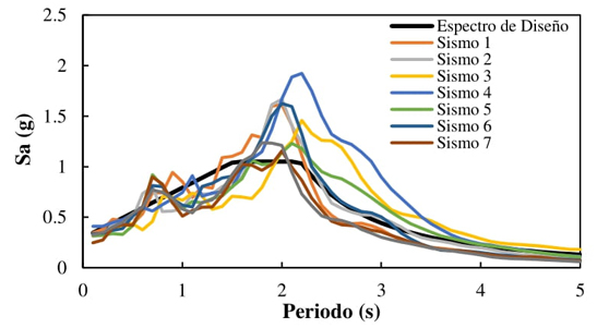 1. En el análisis sísmico se consideraron las dos componentes horizontales ortogonales de los sismos (N-S y E-O) escalados mediante el procedimiento propuesto por Bojórquez et al. (2013), el cual se basa en la combinación de los algoritmos genéticos y el parámetro adimensional Np, cuyo objetivo es la igualdad espectral entre el espectro de diseño y el espectro promedio de un conjunto de registros sísmicos. El espectro de diseño utilizado se muestra en la Figura 3.