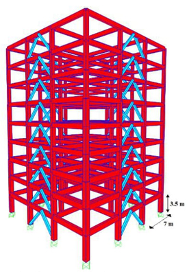 Para validar la metodología propuesta, se utilizan dos sistemas duales compuestos por marcos de concreto reforzado con contravientos restringidos contra pandeo de 9 (CR-CRP9) y 12 (CR-CRP12) niveles. Las dos estructuras poseen las mismas dimensiones de planta de 21 x 21 metros, compuestas por tres crujías de 7 metros de largo en ambas direcciones. De igual manera, poseen la misma altura de entrepiso de 3.5 metros. Para evitar esfuerzos de torsión, los CRP se colocan únicamente en la crujía intermedia de los marcos perimetrales. Para una mejor visión de los modelos utilizados, la Figura 4 muestra el modelo CR-CRP9.