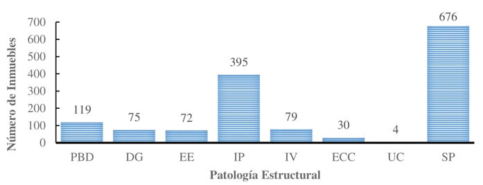 El Instituto de ingeniería de la UNAM (II-UNAM) y el Instituto de seguridad para las construcciones (ISC) con apoyo de las inspecciones realizadas por el programa de reconstrucción del gobierno de la CDMX contabilizaron más de 13 mil revisiones de inmuebles, organizando la información en una base de datos. En esta base de datos se lograron identificar algunas estructuras con daños que van desde menores hasta el colapso, con patologías aisladas y muchas otras con combinación de 2 o más patologías (figura 1), con las siguientes cantidades: 119 casos para planta baja débil (PBD), 75 para el daño por golpeteo (DG), 72 para efecto de esquina (EE), 395 para irregularidad en planta (IP), 79 para irregularidad vertical (IV), 30 para efecto de columna corta (ECC), 4 para ubicación en cuña (UC), 676 sin patologías identificadas (SP) y 12393 edificaciones con combinación de varias patologías (CP).