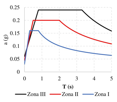 Utilizando las consideraciones establecidas en el RCDF (1976) en los artículos 232 al 236, se obtuvieron los espectros de diseño para cada una de las zonas sísmicas correspondientes definidas en el RCDF (1976), los cuales se presentan en la Figura 10.