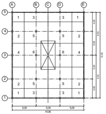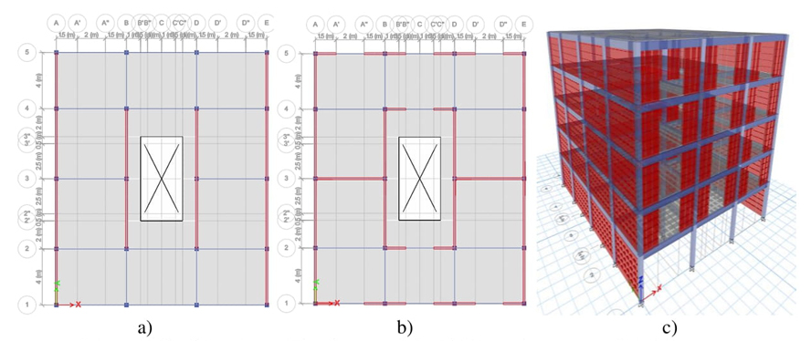 La figura 7a presenta la planta baja “tipo” propuesta en este trabajo. Las dimensiones de la planta corresponden a 15 m de ancho (dirección X para el análisis) y 18 m de largo (dirección Y para el análisis). Los muros de mampostería de relleno (indicados con línea roja en la figura 7) se encuentran colocados a lo largo de los ejes A y E, de tal manera que únicamente aportan rigidez a la dirección Y del análisis. Tanto en el eje 1 como el 5 se encuentran situados los portones de acceso al inmueble, por lo cual, no existen muros en la dirección X del análisis en la planta baja. En el centro de la planta, entre los ejes verticales B y C, y los ejes horizontales 2 y 4, se encuentra el cubo de escalera para el acceso a los demás niveles, que tiene un área de 18 m2.