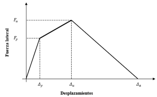 En la figura 14 se presenta la curva que describe la envolvente del comportamiento cíclico de una columna no dúctil tomando en cuenta los puntos críticos que establece el modelo de Elwood y Moehle (2005), en donde se encuentran ubicados el desplazamiento de fluencia (Δy), desplazamiento último (Δu) debido a la falla dominante y el desplazamiento máximo en falla por carga axial (Δa) debido a la combinación del pandeo de varillas y el efecto dominante. En el eje vertical se encuentran la resistencia de fluencia (Fy) y la resistencia última (Fu) correspondientes al efecto dominante.