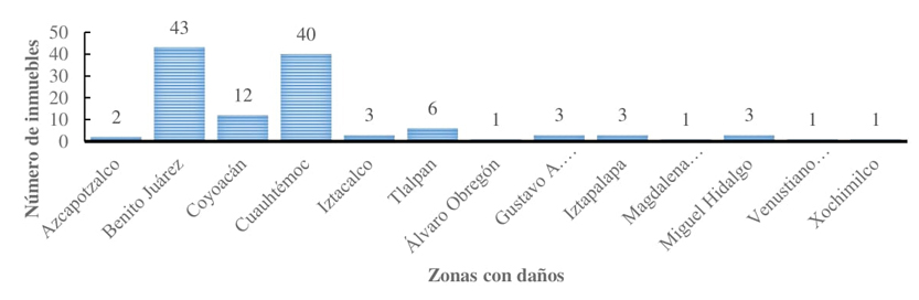 En la figura 2 se muestra la distribución de daños por alcaldías de la Ciudad de México a raíz del sismo del 19 de septiembre de 2017. Alcaldías con mayor número de daños son aquellas que se ubican en terreno blando en la zona del lago.