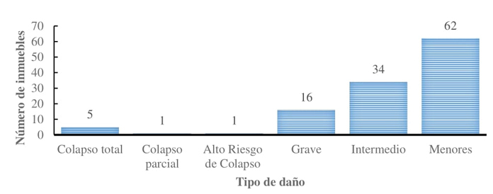 En la figura 3 se muestran los tipos de daños presentes en las edificaciones con PBD revisadas en la base de datos. De un total de 119 inmuebles con PBD se tuvieron 5 colapsos totales, que representa menos del 5% de total de los inmuebles con daños. Si bien el porcentaje parece aceptable si se reconoce que el reglamento permite el daño ante cargas sísmicas de gran intensidad, pero si se incluyen aquellas estructuras que tuvieron colapso parcial, alto riesgo de colapso y daños graves, el porcentaje de estructuras crece al 20%. Esto quiere decir que un gran número de personas fueron desalojadas de su vivienda, lo cual representa una problemática tanto social como económica.