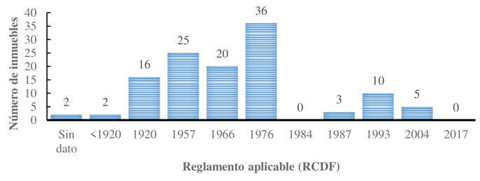 De acuerdo con registros de las revisiones de los inmuebles, se tienen los datos aproximados de las fechas de construcción de los edificios. En muchos casos la información fue proporcionada por los dueños de las construcciones. Es por ello, que, asumiendo dicha información como verídica y confiable, se puede intuir la antigüedad de los inmuebles y con ello el reglamento aplicable correspondiente para cada caso (figura 4).