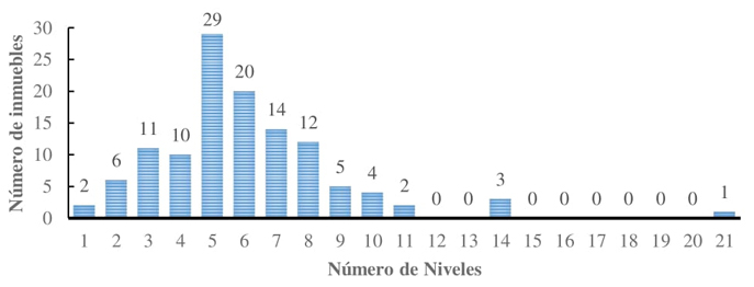 La figura 5 muestra la clasificación de inmuebles de la base de datos por número de niveles, en donde se observa que la mayoría de las construcciones dañadas tienen entre 5 y 8 niveles.