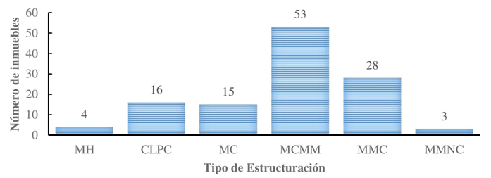 En la figura 6 se muestra el número de inmuebles con problema de planta baja débil de acuerdo con el tipo de estructuración. Para muros de mampostería no confinada (MMNC) y mampostería histórica (MH) se obtuvieron la menor cantidad de estructuras, con 3 y 4 inmuebles, respectivamente. En el caso de marcos de concreto (MC) se obtuvieron 15 unidades, y para columnas con losa plana de Concreto (CLPC) 16 unidades. Finalmente, para muros de mampostería confinada (MMC) y marcos de concreto con muros de mampostería de relleno (MCMM) se obtuvieron las mayores cantidades de inmuebles con 28 y 53 unidades, respectivamente.