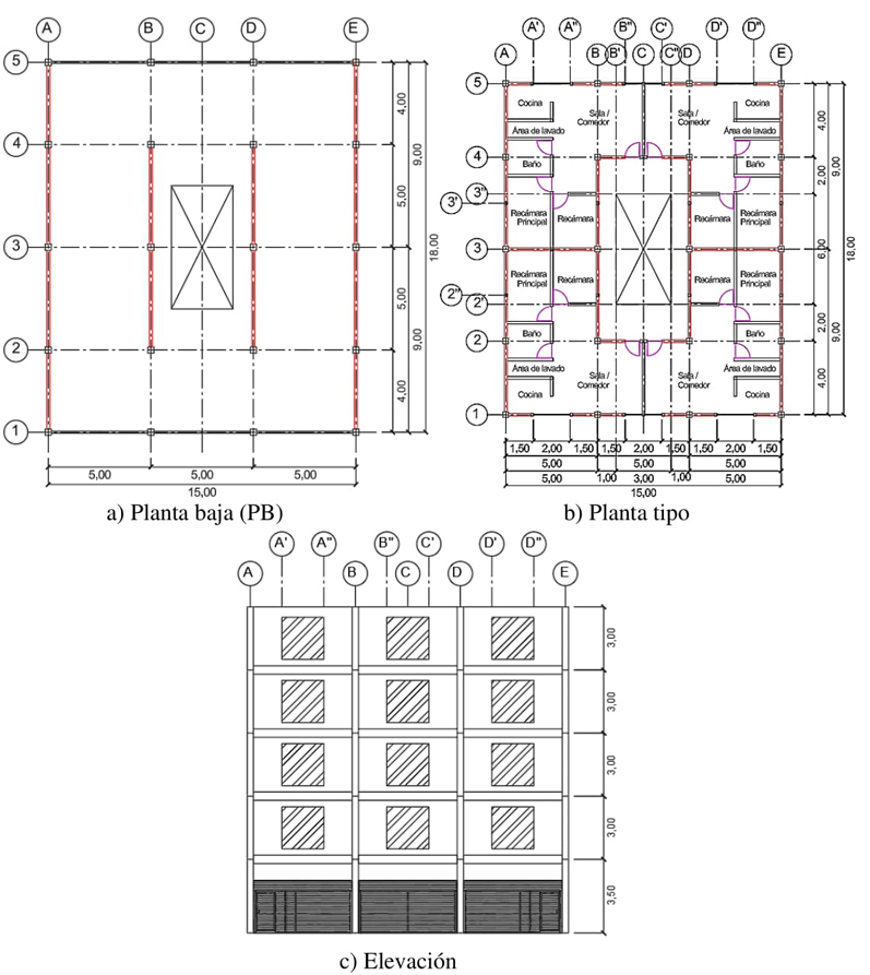La estructura desarrollada para el análisis se trata de una edificación de departamentos de 5 niveles, estructurada mediante marcos de concreto reforzado y muros de mampostería de relleno (MCMM), con una menor densidad de muros en la planta baja debido a que el uso de ésta es de estacionamiento. La altura de la PB es de 3.5 m y la altura del entrepiso tipo es de 3.0 m, por lo que la altura total del edificio es de 15.5 m (figura 7c). Las columnas son continuas en elevación, por lo que la diferencia de rigidez de la planta baja con respecto a los pisos superiores se origina por los muros de mampostería de relleno.
