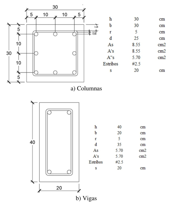 En total se proponen tres casos de estudio cuya geometría, materiales, distribución de espacios y año de construcción serán los mismos. La diferencia entre ellos consiste en los elementos resistentes ante cargas laterales. El primer caso, denominado EC30 corresponde a una edificación de marcos de concreto reforzado con columnas de sección transversal igual a 30x30 cm; el segundo, denotado como EC50 tendrá columnas de 50x50 cm; y el tercero llamado EC70 tendrá columnas de 70x70 cm. La finalidad de este incremento en el tamaño de los elementos sismo-resistentes es verificar la aproximación de los métodos de evaluación utilizados, que están basados en la clasificación de estructuras de acuerdo con el tamaño de los elementos resistentes a fuerzas laterales. En todos los casos se consideran vigas de 40 cm de peralte y 20 cm de base. Los muros de mampostería tendrán 15 cm de espesor, y las losas de entrepiso y azotea 15 y 12 cm de espesor respectivamente. El detallado del refuerzo para los elementos estructurales se presenta en la figura 8, que será el mismo para las columnas de los modelos EC50 y EC70.