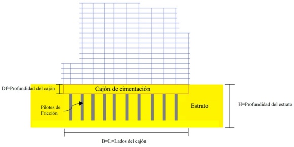 El edificio cuenta con un cajón de cimentación que compensa parcialmente el peso de la estructura, limitado por muros de contención de concreto reforzado en toda la periferia de la cimentación unidos monolíticamente con las losas de fondo, sótano 1 y planta baja. La losa de fondo es de concreto macizo y tiene 0.30 m de peralte, el cajón cubre toda el área de desplante del edificio. El nivel de desplante es diferente en algunas zonas de los extremos y en la parte central. Para fines de este trabajo se consideró una profundidad de desplante uniforme de 9.5 metros.