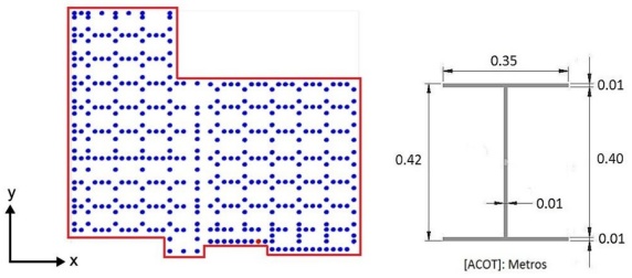 El cajón de cimentación cuenta con contratrabes y se desplanta sobre 447 pilotes de fricción distribuidos en toda la planta. Los pilotes son tipo tensa de sección transversal en H, de 0.35 m de ancho de patín y 0.40 m de longitud del alma, con una longitud promedio de 25.4 metros. La distribución de los pilotes y la geometría general del cajón en planta se muestra en la figura 2. El espaciamiento de los pilotes es de 2 m en la parte central, respecto a cada columna y de 0.90 m en la periferia respecto a los muros del cajón de cimentación.