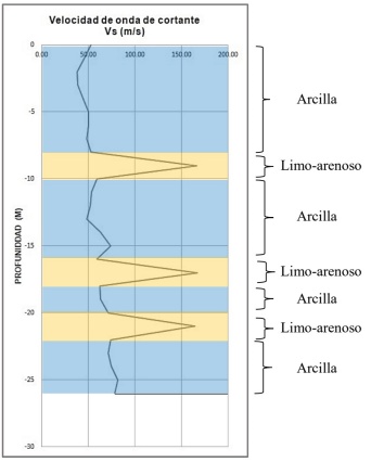El perfil de velocidades de onda propuesto se muestra en la figura 3. De este perfil se pueden identificar claramente cuatro unidades estratigráficas de arcilla de baja rigidez, con velocidades de propagación de onda que oscilan entre los 50 y los 75 m/s, intercaladas con lentes limo-arenosos con velocidades de propagación de onda ligeramente superiores a los 150 m/s. La profundidad de los depósitos profundos se identificó a los 32 m por debajo del nivel de banqueta (26 m de la profundidad de exploración).