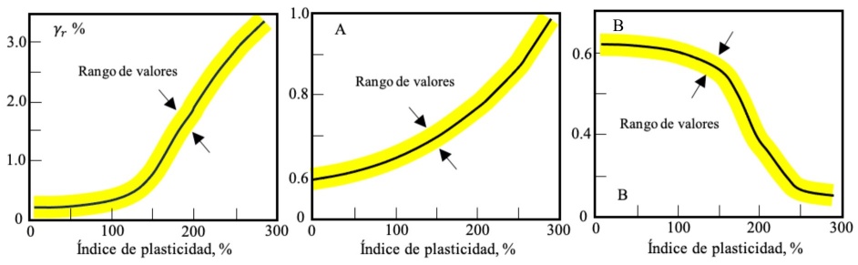 A y B son parámetros del suelo que influyen en la forma de la curva de degradación, y son función del índice de plasticidad del suelo.