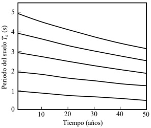 Figura 5 Evolución del periodo dominante de vibración del suelo con el tiempo (Aguilar et al., 2003)