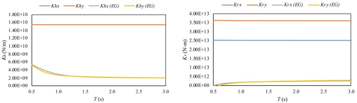 La rigidez dinámica del sistema suelo-cimentación en cada una de sus direcciones puede expresarse en función de su rigidez estática modificada por factores dinámicos, los cuales dependen de la frecuencia de excitación. Existen diversas aproximaciones para el cálculo de estos valores y en este estudio, se utilizan las aproximaciones incluidas en el programa Dyna6.1 (El Naggar et al. 2011). Para el caso del grupo de pilotes de fricción, se ha observado que la consideración de los efectos de grupo (EG) puede modificar de manera significativa la rigidez del sistema en edificaciones desplantadas en las arcillas de la Ciudad de México (Correa y Murià 2005) por lo que en este estudio se han tomado en cuenta.