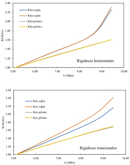Las rigideces del grupo de pilotes son menos sensibles a los incrementos del módulo de rigidez al corte, para ambos modos y ambas direcciones. Por ejemplo, para incrementos de alrededor de 2 del módulo de rigidez al corte, las rigideces del grupo de pilotes en ambos modos y ambas direcciones se incrementan alrededor de un 60%, mientras que para el cajón se identifican incrementos de hasta 140%. Estas diferencias pueden asociarse a los efectos de grupo a los que están sometidos los pilotes, los cuales producen que los incrementos de rigidez por el módulo de rigidez al corte se vean limitados.