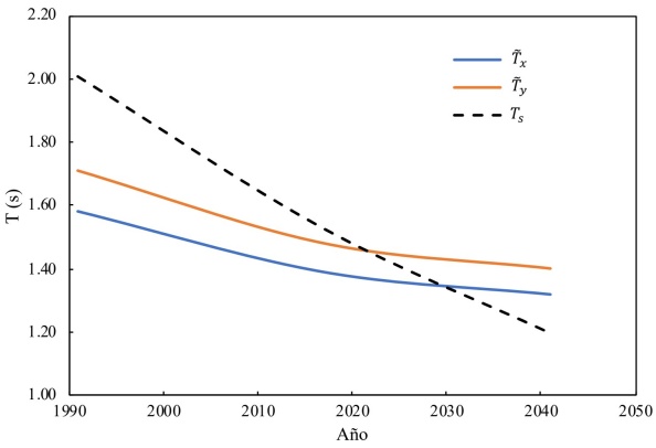 Como ya se ha comentado, el hundimiento regional modifica, tanto el periodo del sitio, como el periodo fundamental de vibrar del sistema suelo cimentación, sin embargo su influencia en ambos parámetros es diferente. En la figura 8, se muestra la evolución tanto del periodo del sitio (estimada con la metodología de Aguilar et al. 2003) como de los periodos fundamentales de vibrar del sistema suelo-cimentación estructura en ambas direcciones, en el periodo de 1991 a 2041. La modificación del periodo del sitio es mucho más pronunciada que las modificaciones en los periodos fundamentales de vibrar del sistema, lo cuál se debe a que, a diferencia de la respuesta dinámica del estrato, el hunidmiento regional solamente afecta a una de las fuentes de rigidez del sistema suelo-cimentación estructura.