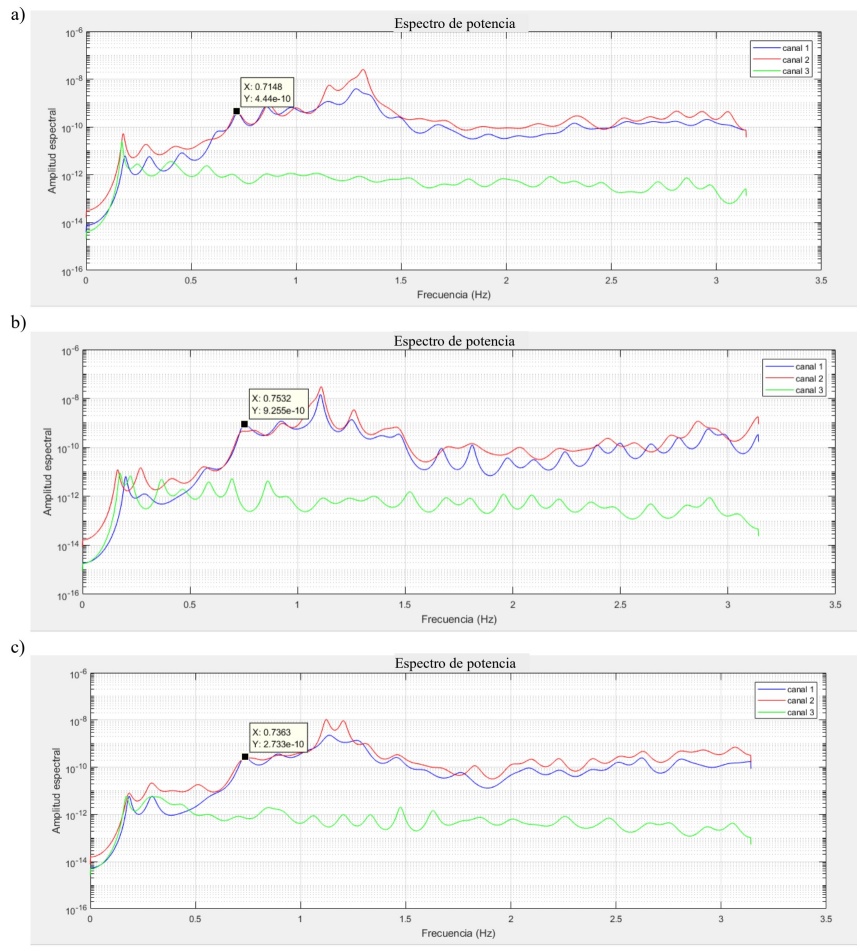 Figura 9 Espectro de potencia de los registros de los sensores de azotea orientados en dirección y (canales 1 y 2 dirección y y en dirección x (canal 3) obtenidos de las campañas de vibración ambiental realizadas en el edificio en el año 2017: a) 11 de septiembre, b) 26 de septiembre y c) 18 de octubre)