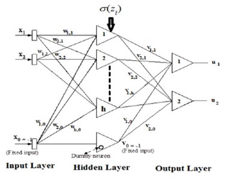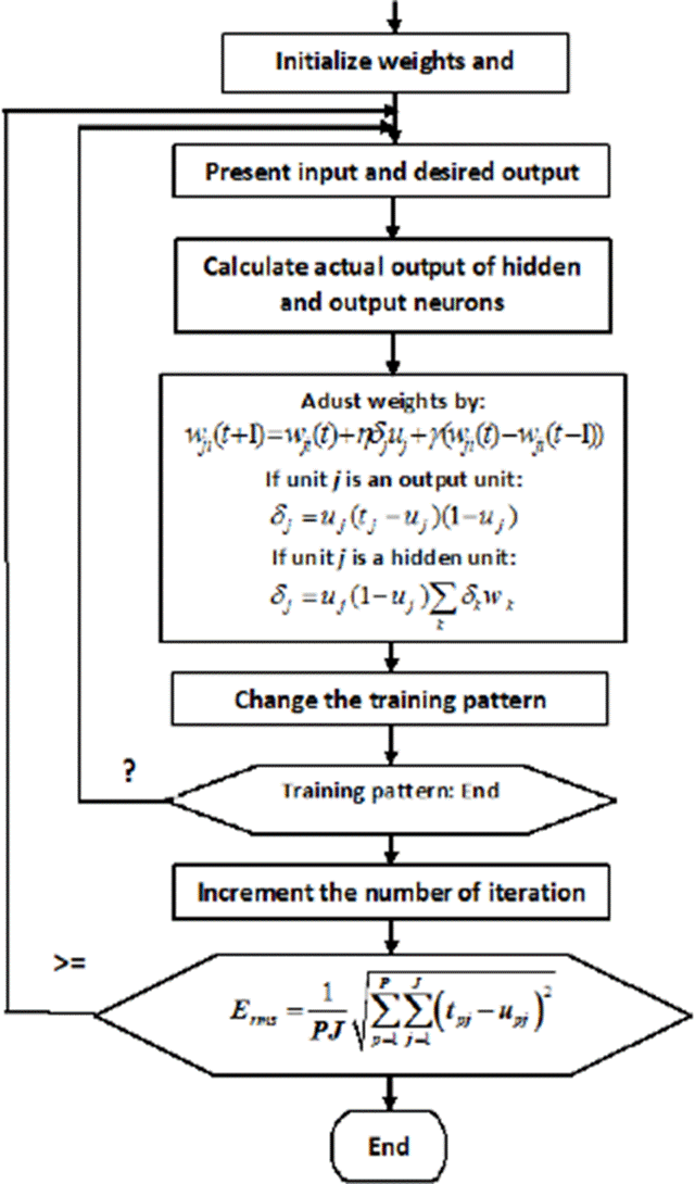 Back-propagation (BP) is a gradient technique that seeks to minimize the mean square error between the actual and predicted outputs of a feed-forward net. It demands continuously differentiable non-linearity. Figure 2 depicts a flow chart of a back-propagation offline learning method (Leshno et al. 1993). We used a recursive technique that started with the output units and moved back to the first concealed layer. To compare the output uj at the output layer to the desired output tj, an error function of the following kind is used: