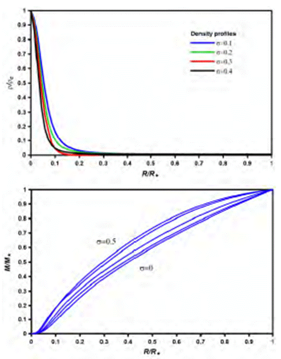 We calculated 50 gas models for the range of the relativistic parameter σ = 0 -0.5 with step 0.01. The radius, density, and mass of the star are calculated for the typical neutron star physical parameters: mass M∗ = 1.5M⊙, central density ρc = 5.75 × 1014 g cm−3, central pressure Pc = 2 × 1033 par, and radius R∗ = 1.4 106 cm. We plotted in Figure 3 the density profiles and the mass-radius relations of the relativistic isothermal gas spheres. Because the effect of the relativistic parameter on the Emden function is smaller than that on the mass function (the relation between the density and the Emden function is given by ρ = ρce−u), we plotted the density profiles for the relativistic parameter values σ = 0.1, 0.2, 0.3, and 0.4 only.