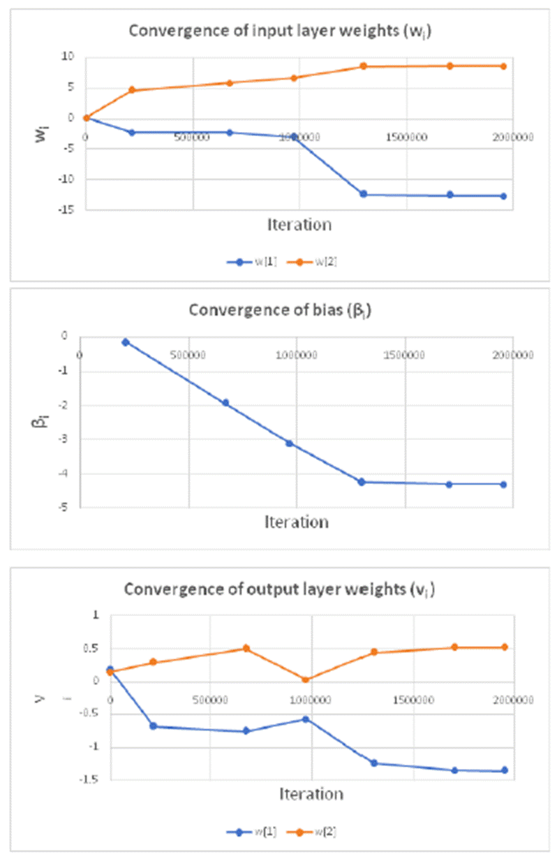 While in the training phase of the NN, we used a value of the momentum (γ = 0.5) and a value for the learning rate (η = 0.03). Those values of γ and η were found to speed up the convergence of the back-propagation training algorithm without exceeding the solution. The convergence and stability behaviors of the input layer weights, bias, and output layer weights (wi, βi, and νi) were studied during the training phase which is shown in Figure 4. The weight values were initialised to random values, which can be seen in such figures, and after a number of iterations, they converged to stable values.