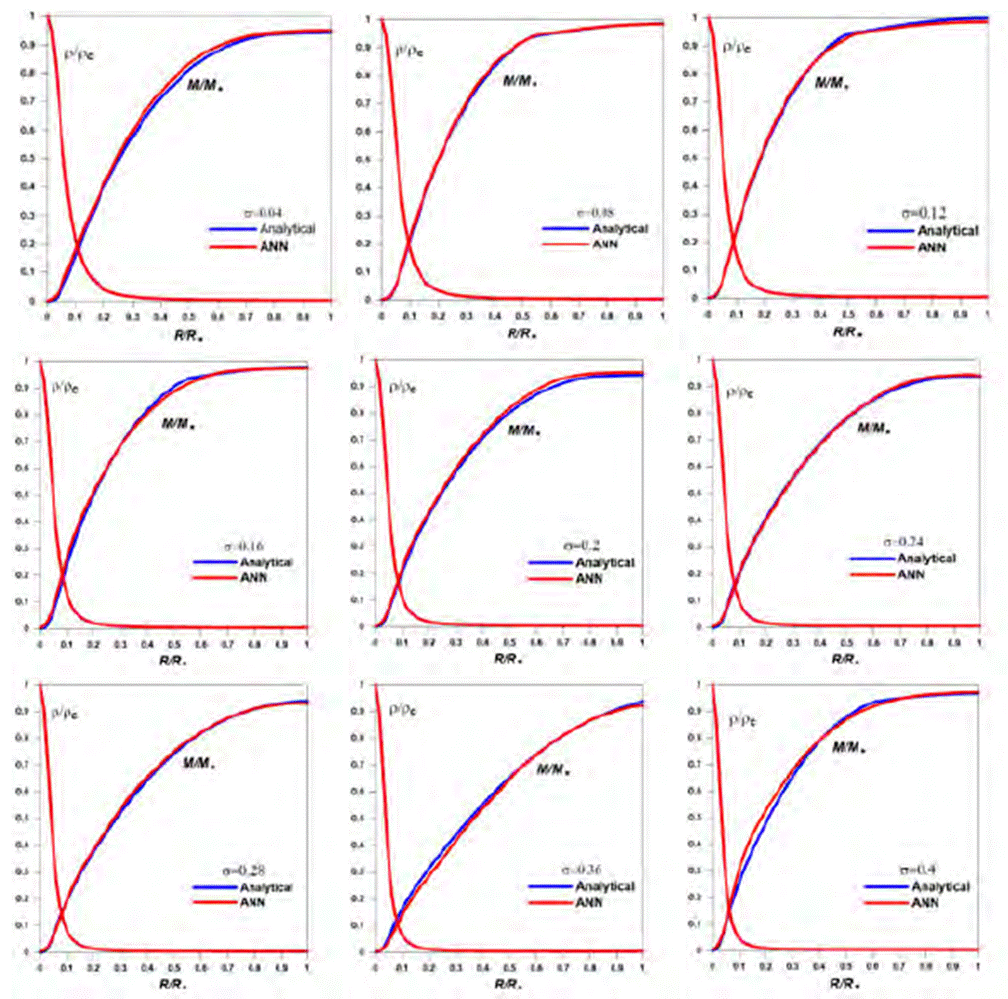 The procedure is repeated for each input pattern until the network output error falls below a preset threshold. The final weights are frozen during the test session and utilized to calculate the precise values of both the density profile and mass-radius relation. To evaluate the training’s success and quality, the error is computed for the entire batch of training patterns using the root-mean-square normalised error, which is defined as: