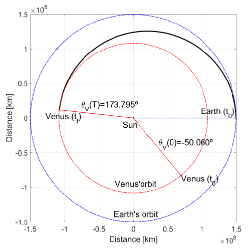 Fig. 28 Optimal Earth-Venus trajectory with a lunar swing-by maneuver. The color figure can be viewed online.